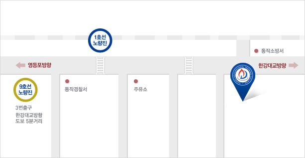 지하철 1호선 용산역 > 인천, 수원, 병점방향 전철승차 > 노량진역 하차 > 육교 건너 왼쪽(한강대교방향 3분거리)